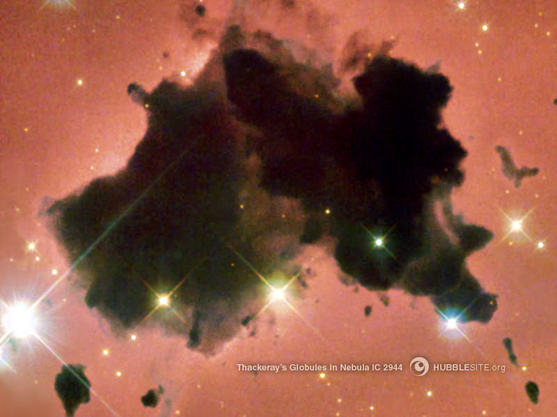 Estas densas y opacas nubes de polvo (conocidas como glóbulos) se ven en silueta contra el rojo resplandor del gas hidrógeno y las brillantes estrellas en esta activa región de formación estelar, IC 2944. Estos glóbulos fueron observados por primera vez por el astrónomo A. D. Thackeray en 1950.