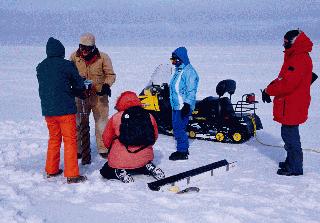 A principios de mayo, el grupo del NAI centrado en Europa emprendió un viaje al casquete polar Ártico hasta Barrow, Alaska. El viaje fue planeado y liderado por el Porfesor Ron Greeley de la Universidad del Estado de Arizona, (sede del Grupo Centrado en Europa), y por Hajo Eicken de la Universidad de Alaska, experto en hielo oceánico y conocedor de la región de Barrow. El objetivo de la conferencia era obtener experiencia directa con hielo marino y buscar posibles analogías con el de la luna de Júpiter Europa y con otras lunas heladas del sistema solar exterior. |