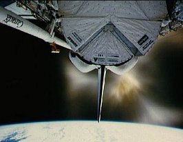 El motor del sistema de maniobrado orbital de la lanzadera espacial (OMS) se dispara mientras la lanzadera viaja “boca abajo” en la órbita baja de la Tierra.
