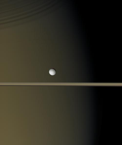 Encelado cuelga como una solitaria perla brillante contra el dorado lienzo de tintes cafés de Saturno y sus gélidos anillos. En Saturno se aprecia la región en donde la luz del día da paso al anochecer. Arriba, los anillos lanzan finas sombras sobre el planeta.