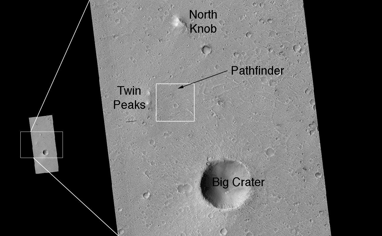 1. Imagen HiRISE: esta es la imagen completa. El cráter en el centro y hacia abajo fue denominado extraoficialmente "Big Crater" por el equipo del Pathfinder. Su pared era visible desde el Pathfinder, situado a 3 kilómetros al norte. Los dos rasgos brillantes arriba a la izquierda de Big Crater son las "Twin Peaks", también observadas por el Pathfinder. El montículo brillante arriba a la derecha de las Twin Peaks es "North Knob", visto en las imágenes del Pathfinder como un pico en el horizonte.