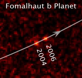 13 de noviembre de 2008: El planeta, llamado Fomalhaut b, cuya masa estimada no es mayor que tres veces la de Júpiter, se localiza a 25 años luz en la constelación de Piscis Australis, o el "Pez del Sur". Formalhaut ha sido un candidato para la caza de planetas desde que se descubrió un exceso de polvo alrededor de la estrella (signo de formación de planetas) en los primeros 80 por el Satelite de Astronomía Infrarroja de la NASA, IRAS. En 2004, el coronógrafo en la Camara de Alta Resolución en la Cámara Avanzada de Hubble para Seguimientos produjo la primera imagen resuelta en luz visible de la región que rodea Fomalhaut. (Nota: Un coronógrafo es un dispositivo que puede bloquear la brillante luz de la estrella central para revelar objetos más debilmente brillates alrededor de ella). Claramente mostraba un anillo de despojos protoplanetarios de unas 21 500 millones de millas que tenía un límite interior definido. Este gran disco de materiales es similar al anillo de Kuiper, que rodea el sistema solar y contiene un catálogo de cuerpos helados desde granos de polvo hasta objetos de la talla de pequeños planetas como Plutón. El astronomo del Hubble Paul Kalas, de la Universidad de California en Berkeley, y los miembros de su equipo, propusieron en 2005 que el anillo estaba siendo gravitacionalmente modificado o "pastoreado" por un planeta que se situaba entre la estrella y el borde interior del anillo. Ahora, Hubble ha fotografiado de hecho un punto fuente de luz situado 1 800 millones millas hacia dentro del borde interior del anillo. Los resultados estan siendo notificados en la entrega del 14 de noviembre de la revista Science. "Nuestras observaciones del Hubble son increiblemente exigentes. Fomalhaut b es mil millones de veces menos brillante que la estrella. Empezamos el programa en 2001, y nuestra persistencia se ha visto finalmente recompensada", dijo Kalas. Observaciones del coronógrafo de la Cámara Avanzada de Hubble para Seguimientos, separadas 21 meses entre ellas, muestran que el objeto se está moviendo siguiendo un camino alrededor de la estrella, y está por tanto gravitacionalmente ligada a él. El planeta está a 10 700 millones de millas de la estrella, unas 10 veces la distancia de Saturno al Sol. El planeta es más brillante de lo esperado para un objeto con tres veces la masa de Júpiter. Una posibilidad es que tenga un anillo semejante al de Saturno de hielo y polvo que refleje la luz estelar. El anillo podría eventualmente coalescer para formar lunas. La talla estimada del anillo es comparable a la región alrededor de Jupiter y sus cuatro satélites mayores.